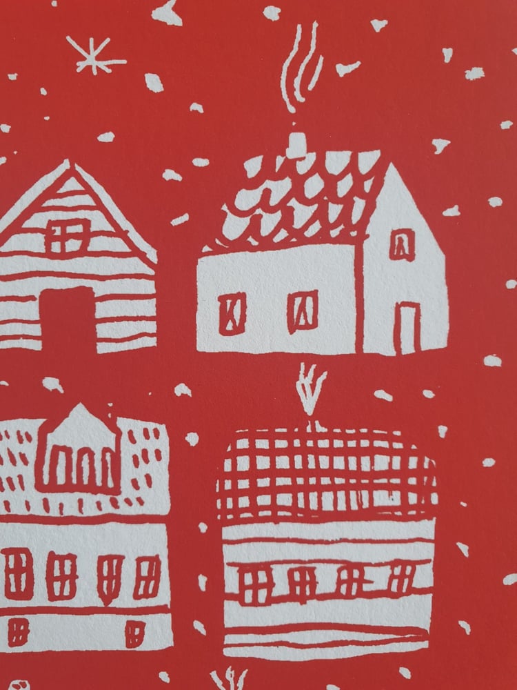 A set of 8 A6 single "Julebyen"(the christmas town) christmas cards with envelopes. Matte premium quality postcards. Illustration and design by Oda Valle Illustration.