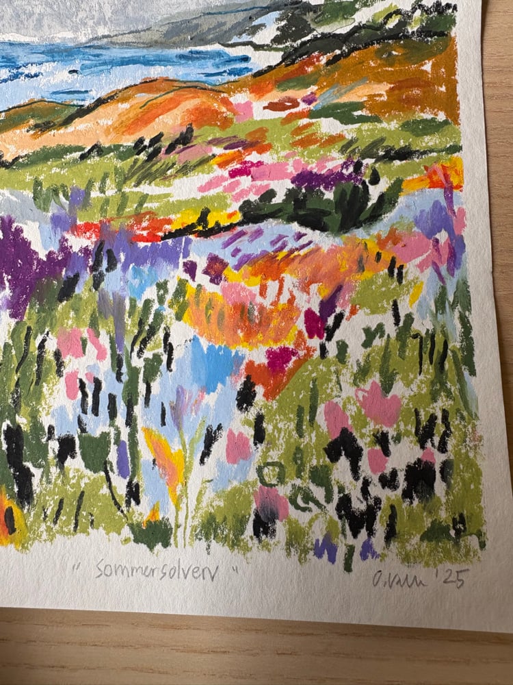 One of a kind original art piece with the title «sommersolverv» (summer solstice), made 2025. 18x24 cm. Wax oil pastels on watercolor paper from Fabriano. High quality cotton paper 300 g. Shipped with a tracking code. Signed.