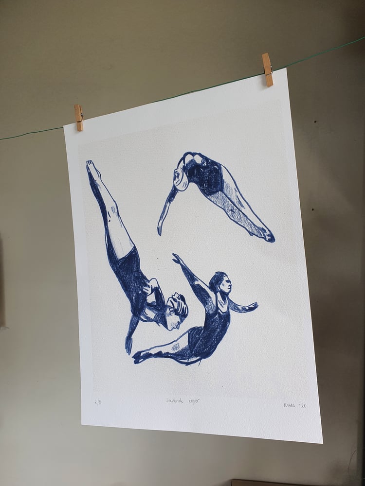 "Svevende engler" Fine art trykk på hahnemuhle akvarellpapir. Opplag på bare 30 stk. Signert og nummerert. Format 30 x 40 cm. Sendes flatt. Godt pakket inn. // "Svevende engler" printed on fine art watercolor paper from Hahnemuhle. Limited edition of only 30. Size 30x40 cm. Signed and numbered. Carefully shipped.
